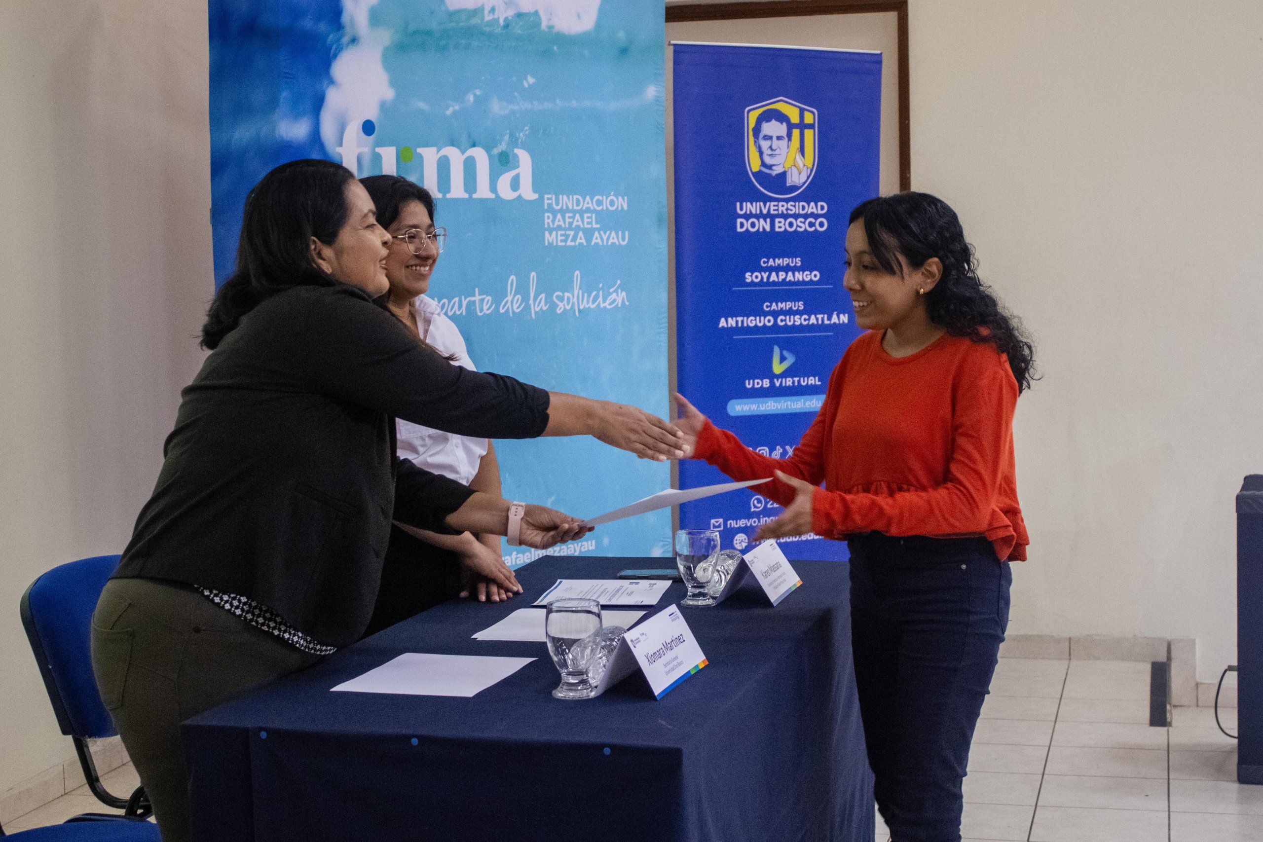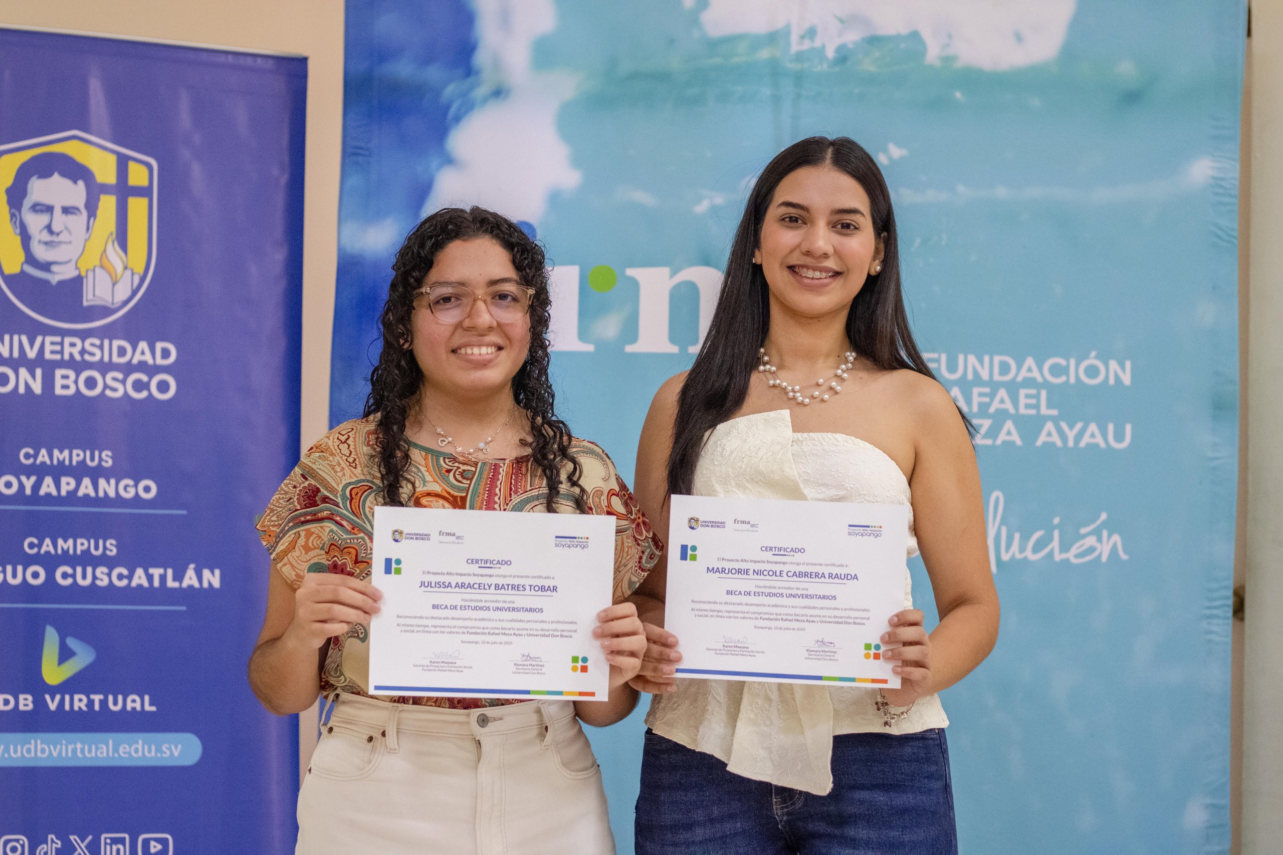 El 10 de julio, en el marco del Proyecto Alto Impacto Soyapango, se llevó a cabo la entrega de 23 becas universitarias a estudiantes del municipio de Soyapango que estudian carreras técnicas e ingenierías en áreas STEM en la Universidad Don Bosco (UDB). Cada joven beneficiado recibió un diploma que simboliza la oportunidad de continuar su formación académica y avanzar en su proyecto de vida. Con esta iniciativa, FRMA y la UDB reafirman su compromiso de abrir caminos de oportunidad para la juventud, impulsando la educación superior como motor de transformación social y de construcción de un futuro con más posibilidades.